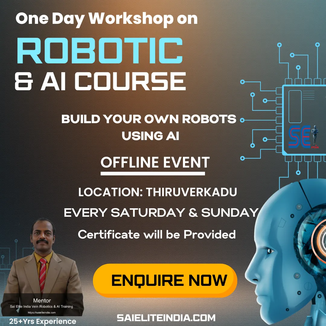 Join our One-Day Robotic & AI Workshop and experience hands-on learning in automation and intelligent robotics. Guided by industry experts, this offline workshop empowers you to build your own robots using Artificial Intelligence — from concept to control — and earn a certificate of completion to showcase your new skills!